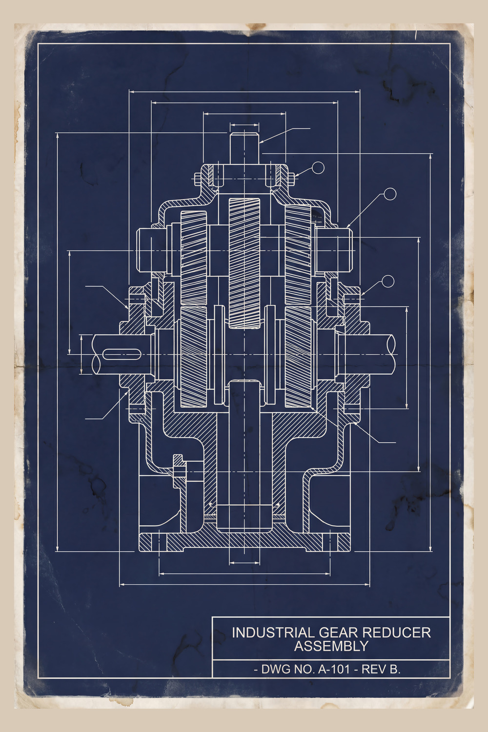 This detailed technical illustration presents a comprehensive longitudinal cross-section of an industrial-era mechanical system. Rendered in fine black ink, the schematic showcases internal components like flywheels, pistons, and belt-driven pulleys. The artwork is set against a background of heavily distressed, yellowed paper with frayed, deckle edges and antique foxing, creating an authentic steampunk or historical archive aesthetic.